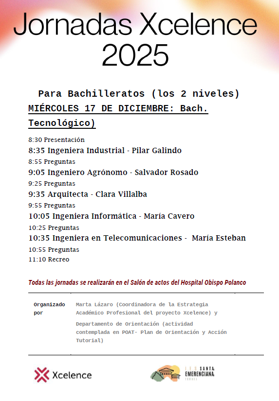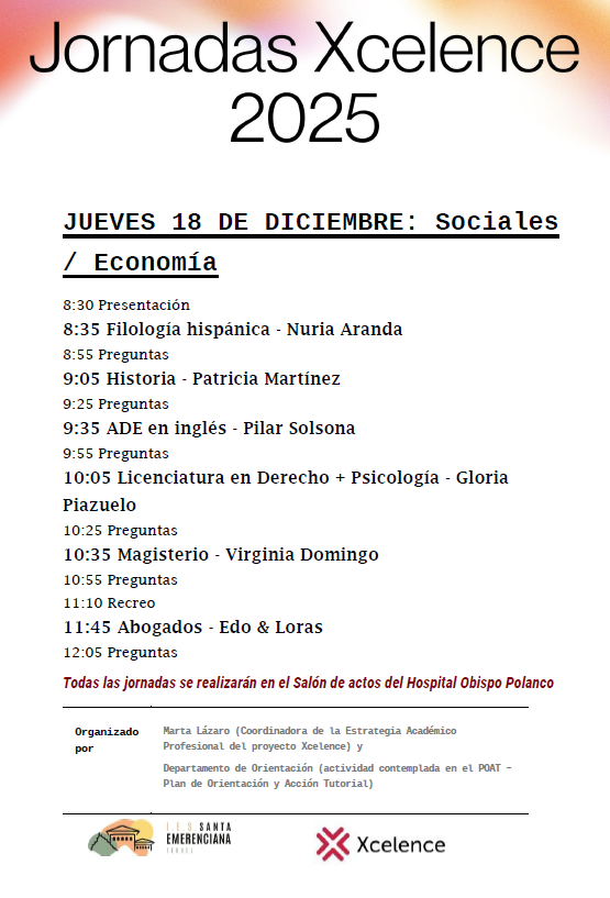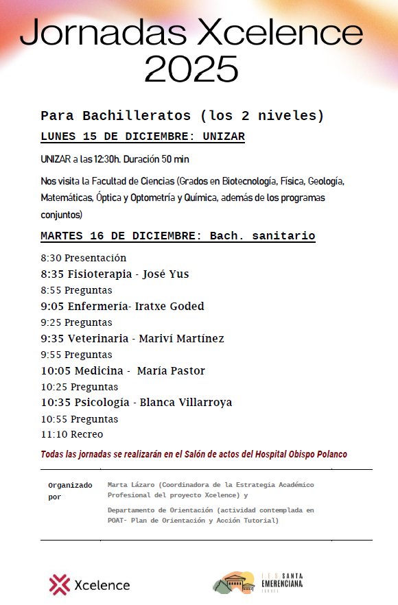 La semana del 15 de diciembre se realizarán en el centro las Jornadas Xcelence 2025. Este programa acerca a los alumnos y alumnas de bachillerato a profesionales de diferentes ramas para que, de forma cercana y amena, les cuenten sobre sus años de formación y su trayectoria profesional posterior.